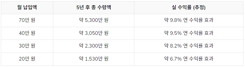 - 정부기여금 : 최대 월 3.3만 원까지 지원 (소득에 따라 차등)