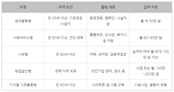 | 공익활동형 | 만 65세 이상, 기초연금 수급자 | 환경정화, 캠페인, 시설지원 | 월 약 30만 원 |