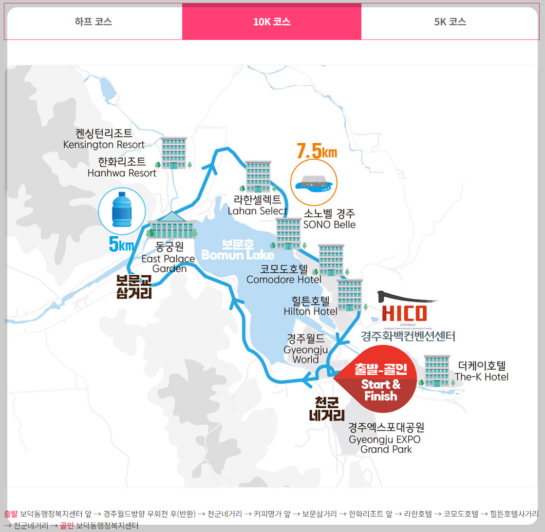10km 코스는 보문관광단지 내 보문호를 중심으로 구성되어 있어요.